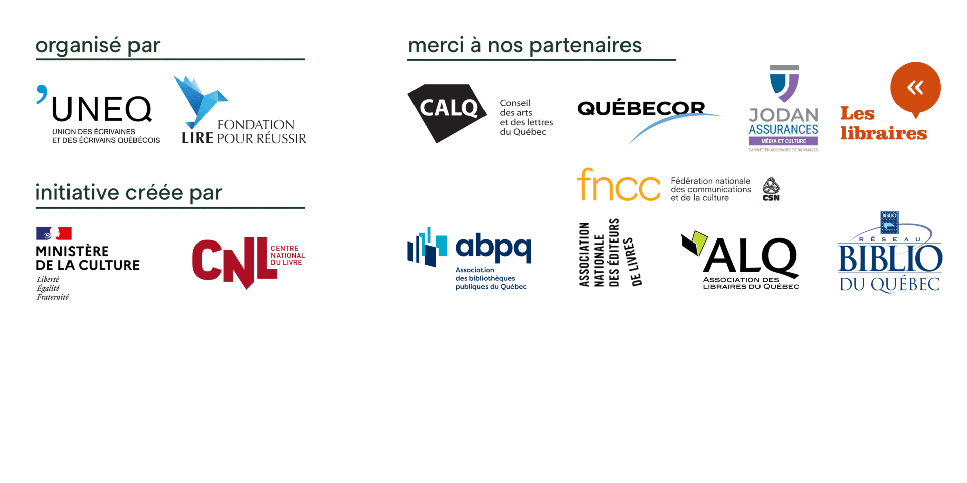 La Nuit de la lecture au Québec bénéficie du soutien du Conseil des arts et des lettres du Québec (CALQ), de Québecor, de la FNCC-CSN et de Jodan Assurances. Le projet est également appuyé par l’Association des bibliothèques publiques du Québec (ABPQ), l’Association des libraires du Québec (ALQ), l’Association nationale des éditeurs de livres (ANEL), le Réseau BIBLIO du Québec, le Centre national du livre et la Coopérative Les libraires des Librairies indépendantes du Québec (LIQ).