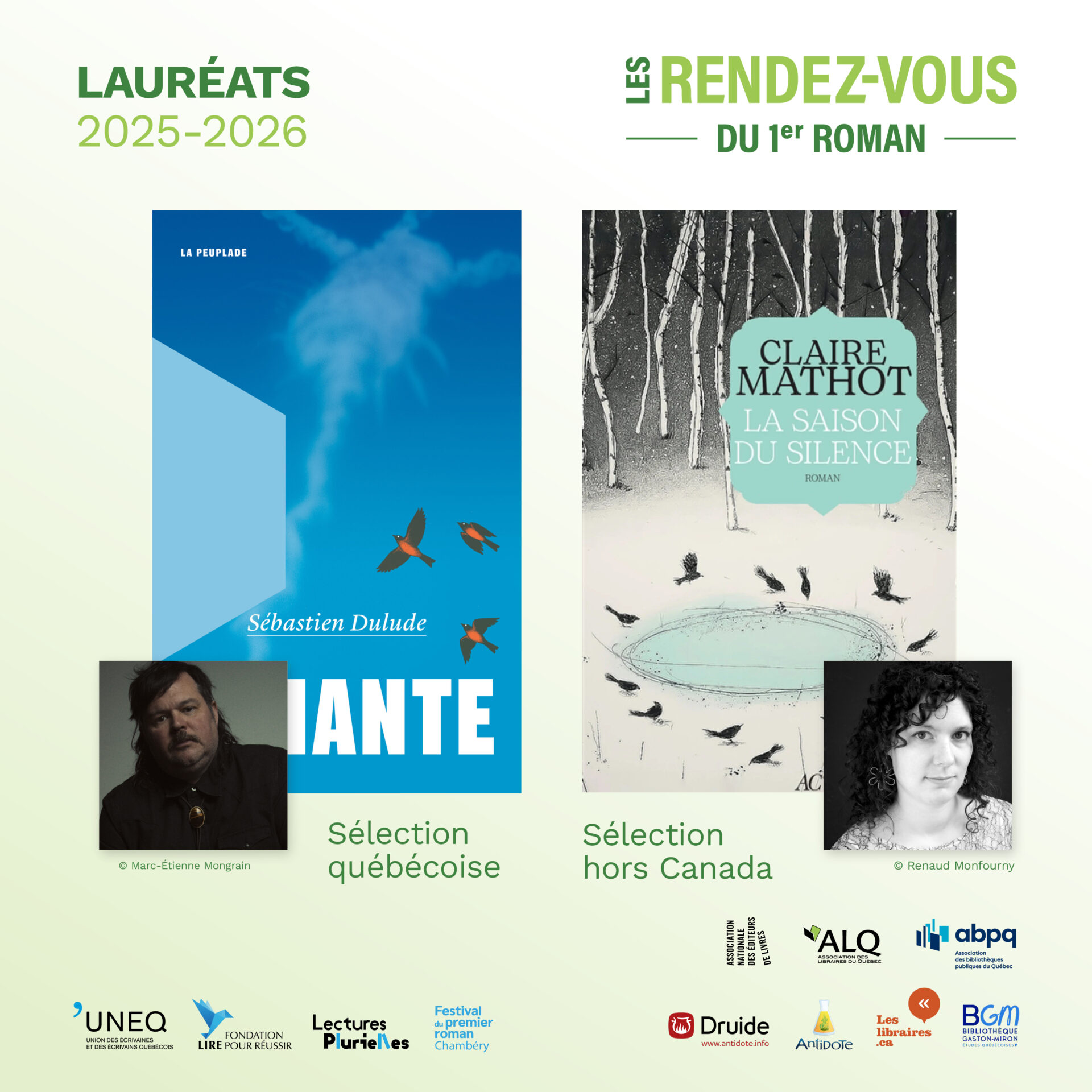 | Les deux lauréat.e.s prendront part au Festival du premier roman de Chambéry, du 28 au 31 mai 2026.